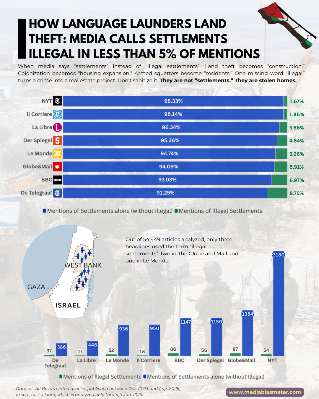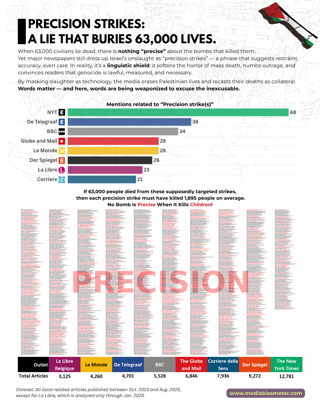 - Upplýsingar frá palestínumönnum eru dregnar í efa með því að gefa til kynna að um fullyrðingu sé að ræða en ekki staðreynd, „Heilbrigðisráðuneyti Gaza sagði„, eða hlutlaust tilgreina atburði þar sem gerandi er ekki nefndur, „hefðu verið drepin„, og að afmennska með köldum hætti þegar börn eru myrt, „undir 18 ára aldri„.