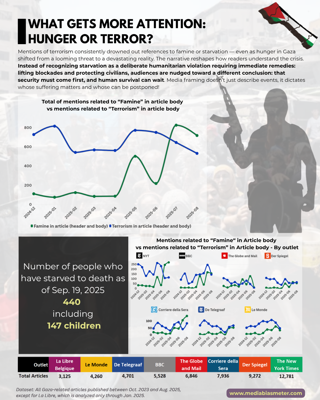 Samkvæmt greiningu þriggja helstu fjölmiðla voru gildishlaðin lýsingarorð (e. emotive terms) oftar notuð til að lýsa dauðsföllum ísraelsmanna en dauðsföllum palestínumanna, sérstaklega á fyrstu vikum þjóðarmorðsins.