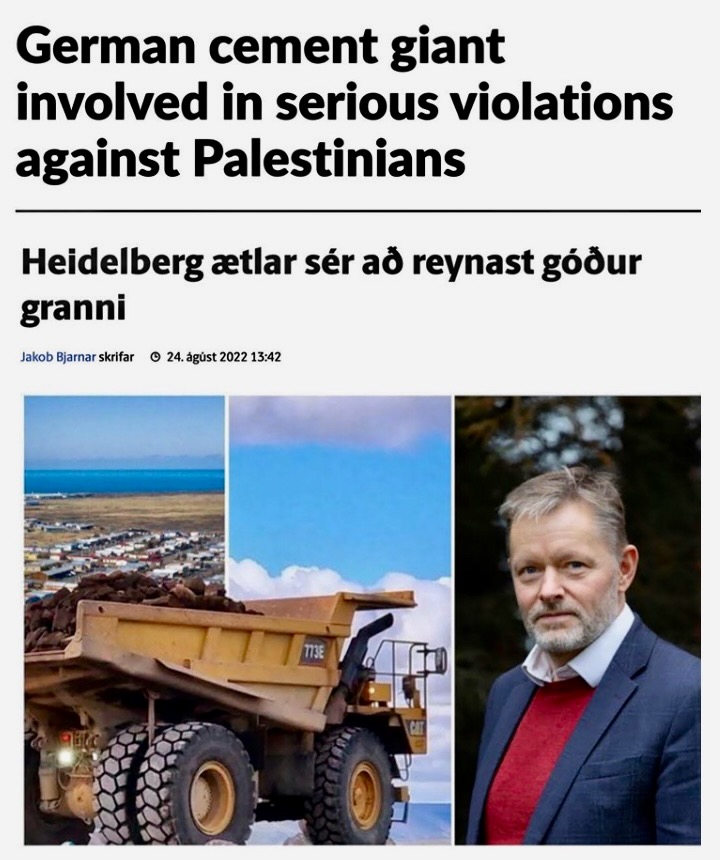 Umsögn Þorsteins stingur í stúf við starfsemi Heidelberg Cement á hernumdum svæðum í Palestínu. Þar á fyrirtækið þátt í að ræna náttúruauðlindum úr Nahal Raba námunni á landi þorpsins Al-Zawiya á Vesturbakkanum, með alvarlegum mannréttindabrotum gegn Palestínumönnum, að því er fram kemur í nýrri skýrslu hollensku samtakanna SOMO og mannréttindasamtakanna Al-Haq.