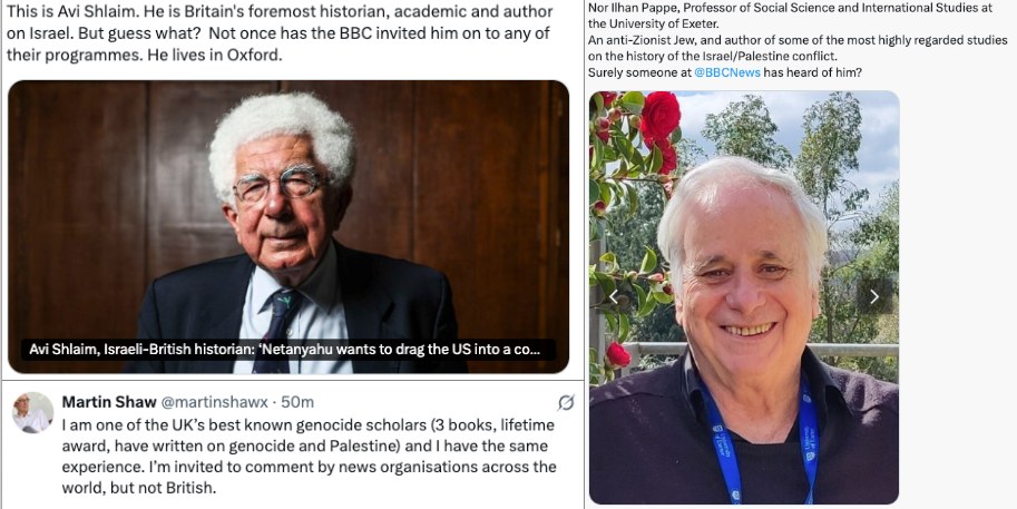 Palestínufólk og palestínskt fræðafólk og álitsgjafar hafa alltaf verið sniðgengin af vestrænum meginstraumsmiðlum. Þar ríkja raddir vestrænna og ísraelskra stofnana. Í þessum miðlum, eins og ríkismiðlum Evrópuríkja á borð við RÚV og BBC, og bandarískum miðlum eins og CNN og New York Times, svo ekki sé talað um aðra bandaríska öfgahægrimiðla, er nánast aldrei talað við palestínskt fræðafólk né heldur við sérfræðinga um Palestínu annars staðar að. Þannig er aldrei talað við ísraelsku Gyðingana Ilan Pappé eða Avi Shlaim í Bretlandi þó að þeir búi þar og séu háskólaprófessorar þar, sérfræðingar í landráni Ísraels í Palestínu, með langan lista af bókum, vísindagreinum og verðlaunum í sínu farteski.