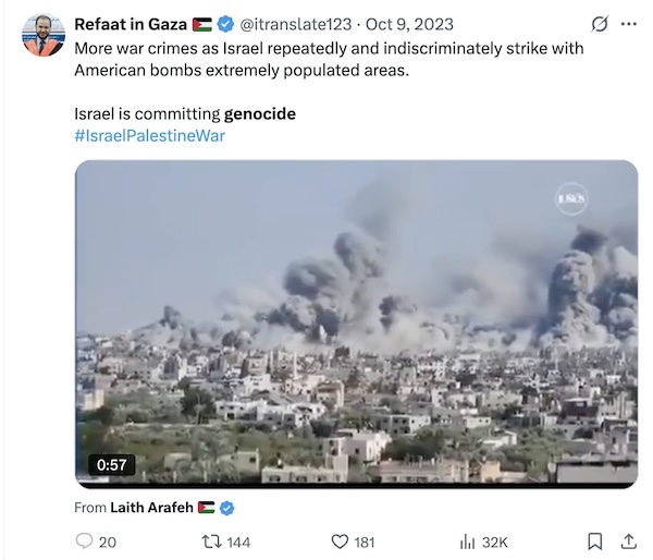 Refaat Alareer, prófessor í enskum bókmenntum við Íslamska háskólann á Gaza, kom fram í fjöldamörgum þáttum í ýmsum miðlum (þó ekki á meginstraumnum) upp úr 7. október. Ísrael myrti hann svo í desember 2023. Hann var drepinn af yfirlögðu ráði og honum hafði verið tilkynnt það fyrir fram af ísraelska hernum. Hér er tvít hans frá 9. október: