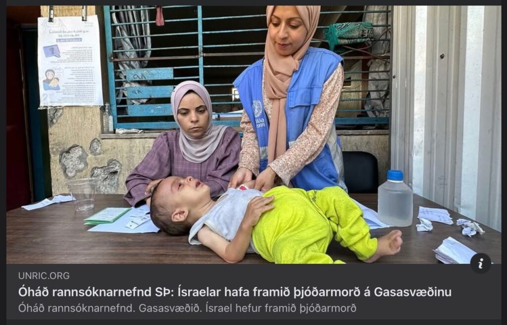 Óháð rannsóknarnefnd. Gasasvæðið. Ísrael hefur framið þjóðarmorð á Palestínumönnum á Gasasvæðinu að mati sjálfstæðrar alþjóðlegrar rannsóknarnefndar Sameinuðu þjóðanna. Nefndin skorar á Ísrael og öll ríki að virða lagalegar skuldbindingar samkvæmt alþjóðalögum og binda enda á þjóðarmorðið og refsa hinum seku.
